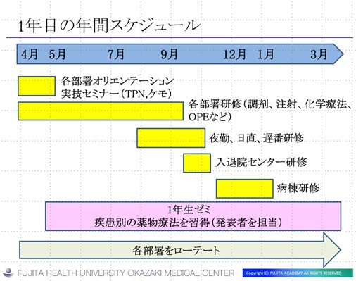 「薬あるところに薬剤師あり」を基本に「薬剤師が出来ることは何でもやる」「薬剤師は臨床家であり研究家である」「患者のために適正な薬物治療を提供する」のポリシーで、様々な活動、改革に挑戦し、臨床・研究・教育で日本一を目指す姿勢を持つことを目的とし、基本的な薬剤師業務の実践スキルを習得することを目標としています。